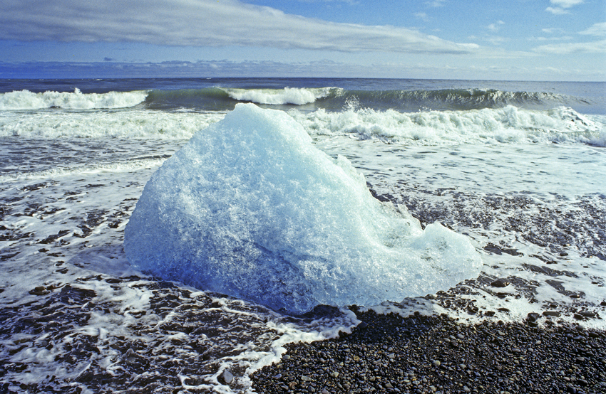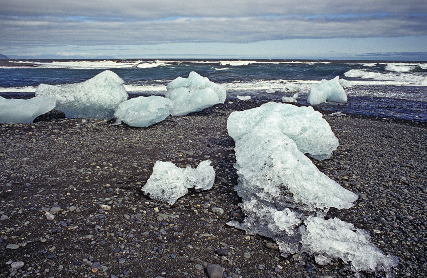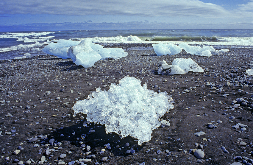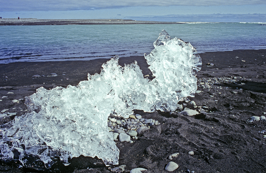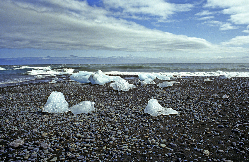 Hier werden die Eisberge, die durch den kleinen Fluss, der die Gletscherlagune mit dem offenen Meer verbindet an den Strand gespült. Die Vielzahl der